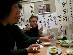 | 美味しいお刺身と大漁鍋に、ご満悦のアラン。 | |